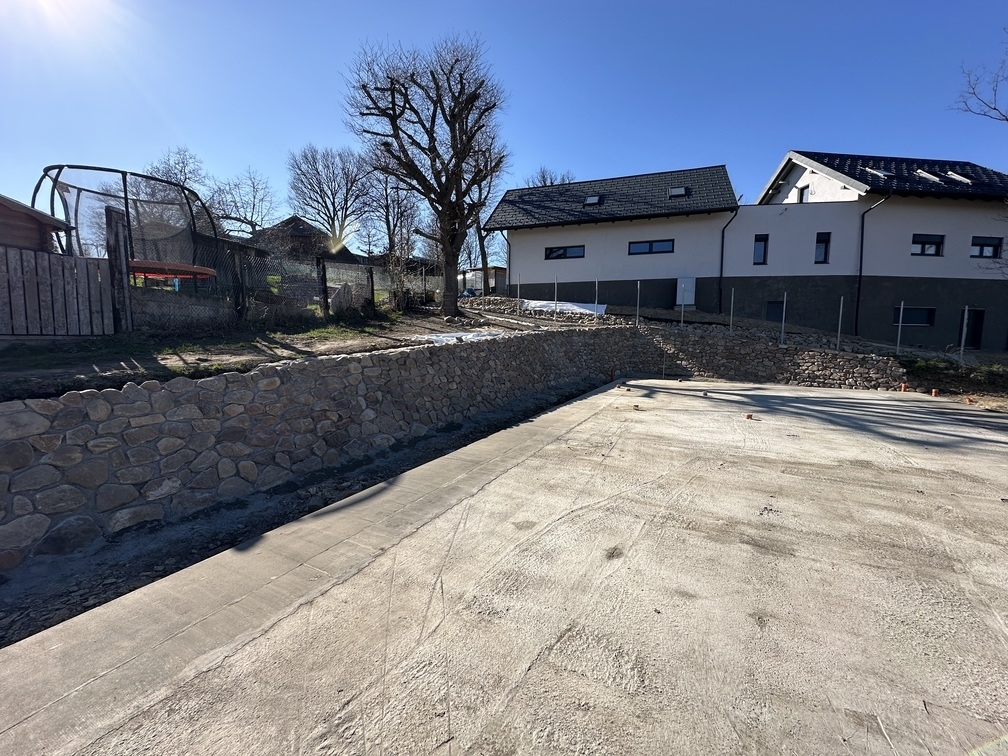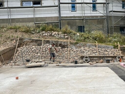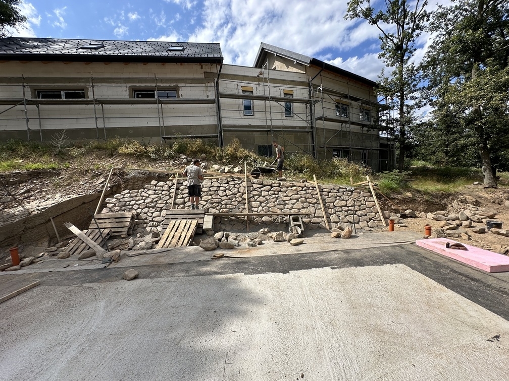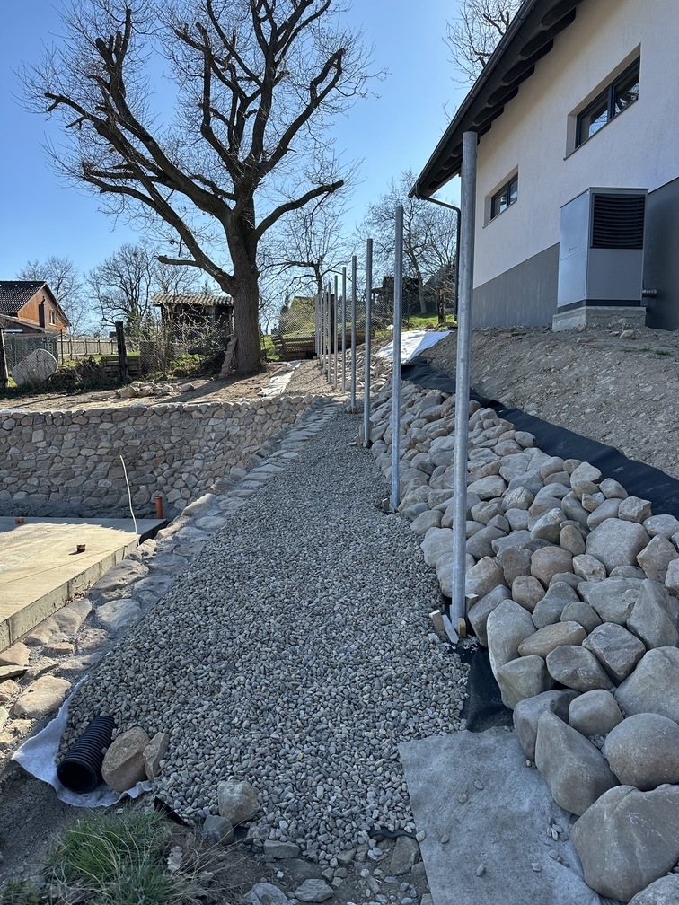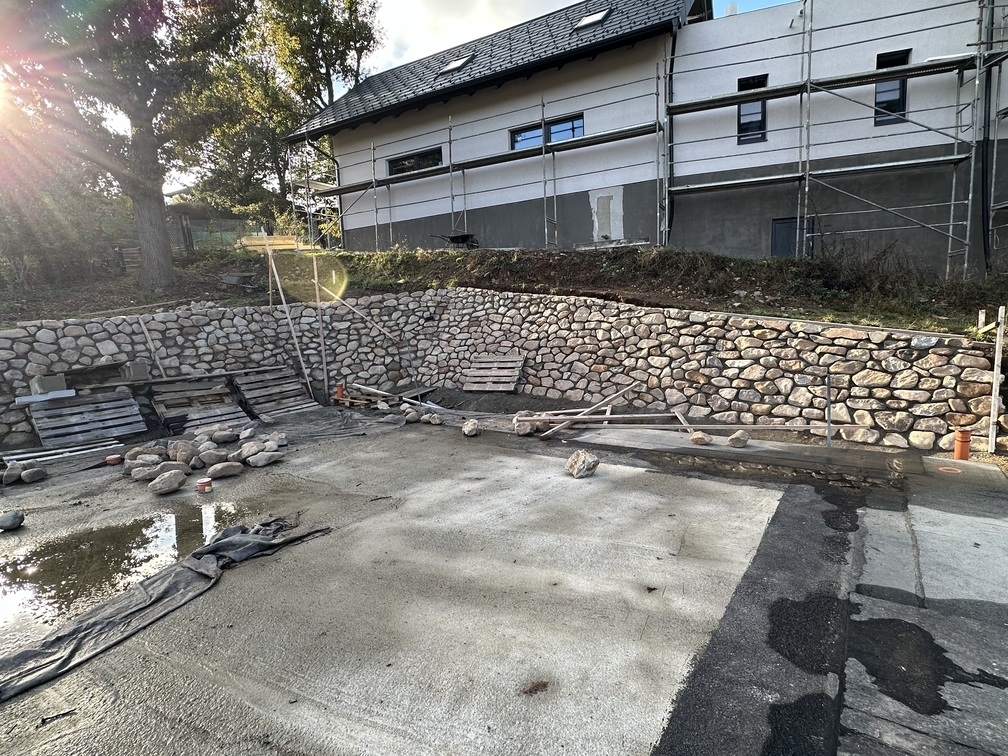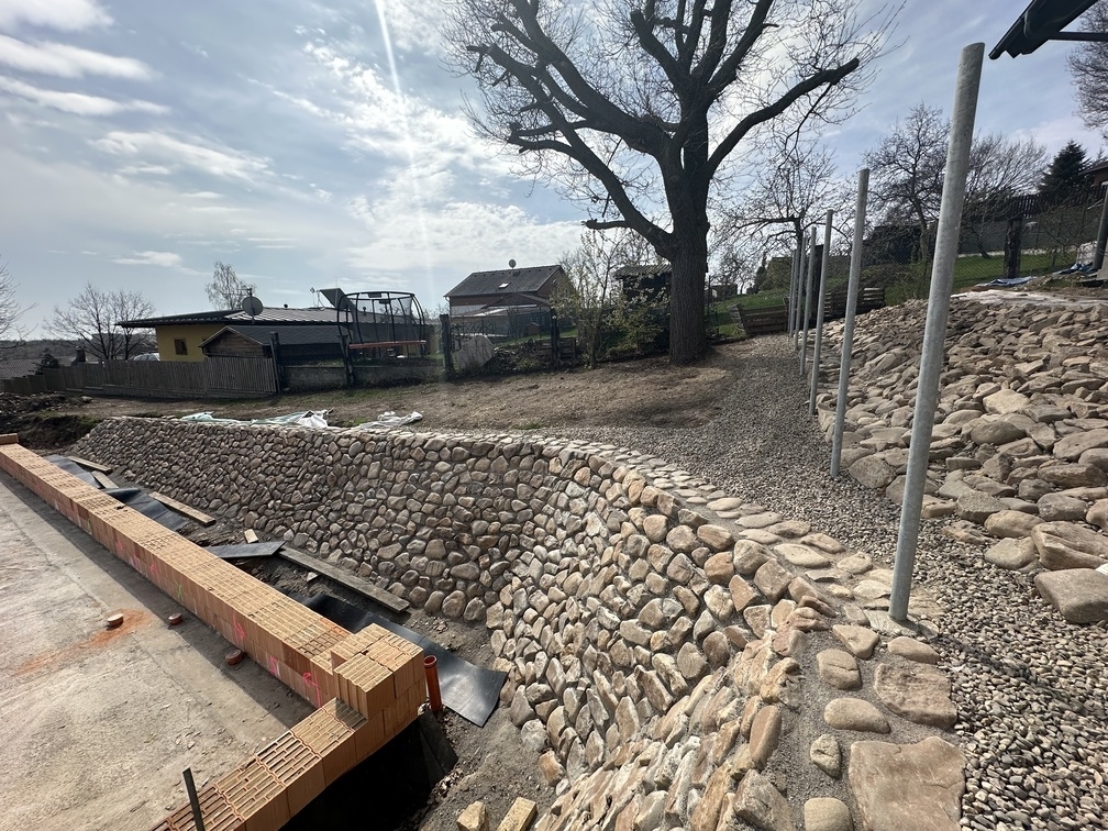 Na základě požadavků investora byla okolo budoucího RD vybudována kamenná opěrná zeď z říčních kamenů. Tyto kameny byli ukládány do betonového lože do požadovaného sklonu.