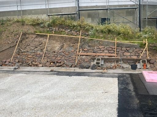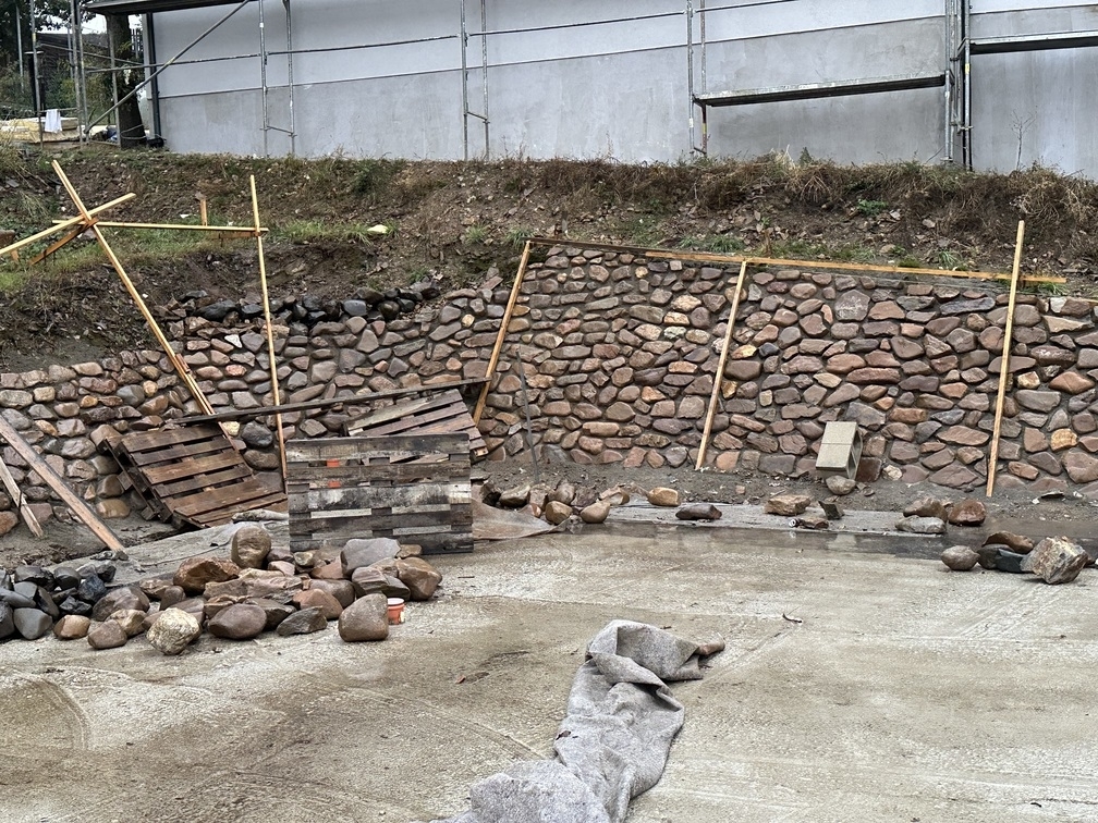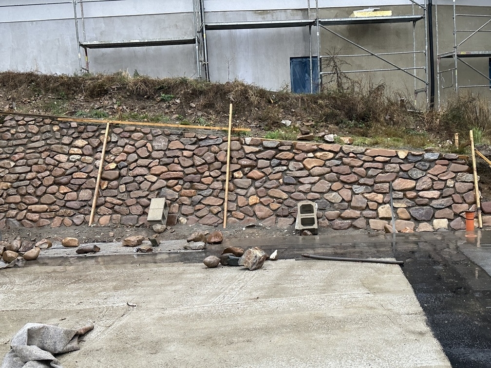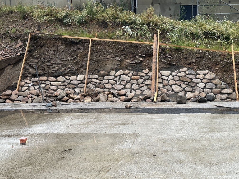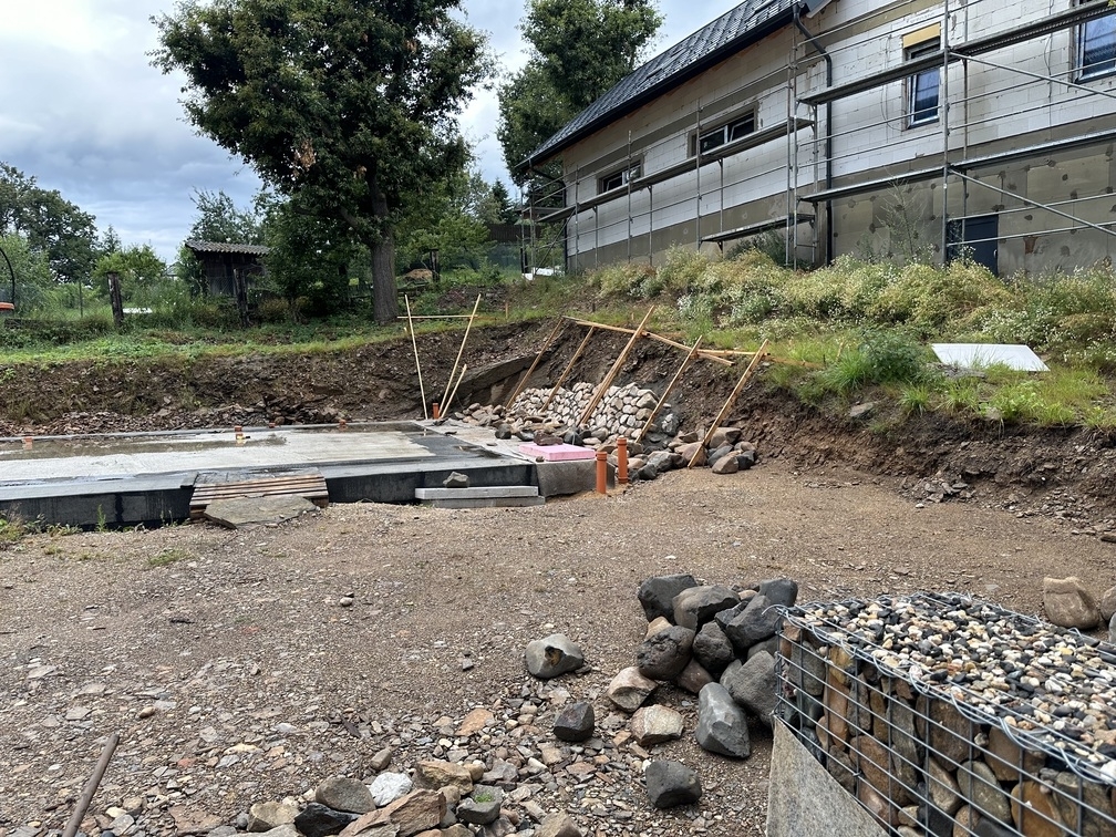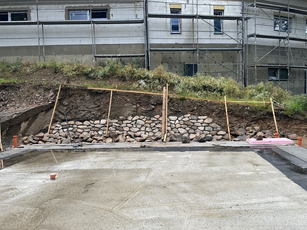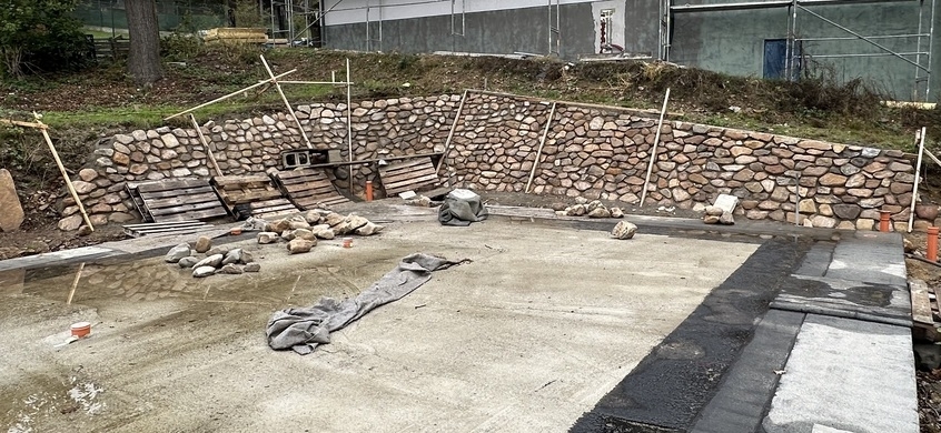 Na základě požadavků investora byla okolo budoucího RD vybudována kamenná opěrná zeď z říčních kamenů. Tyto kameny byli ukládány do betonového lože do požadovaného sklonu.
